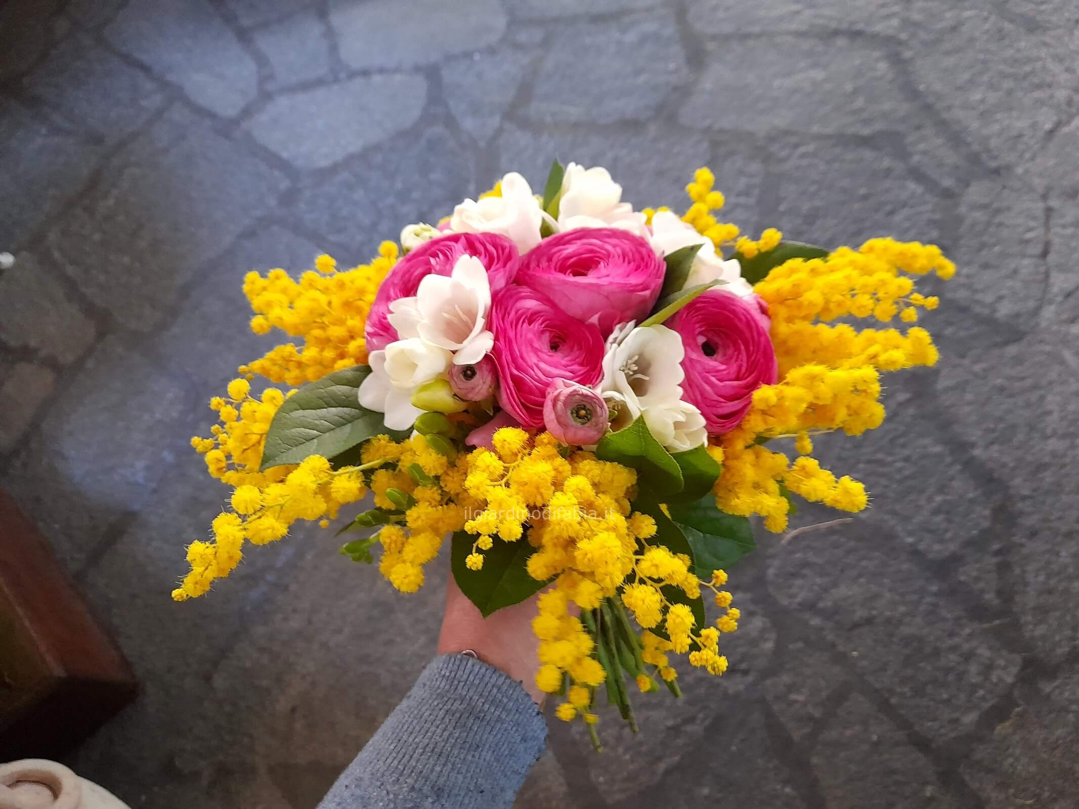 Bouquet medio di mimosa con ranuncoli, o fresie o anemoni